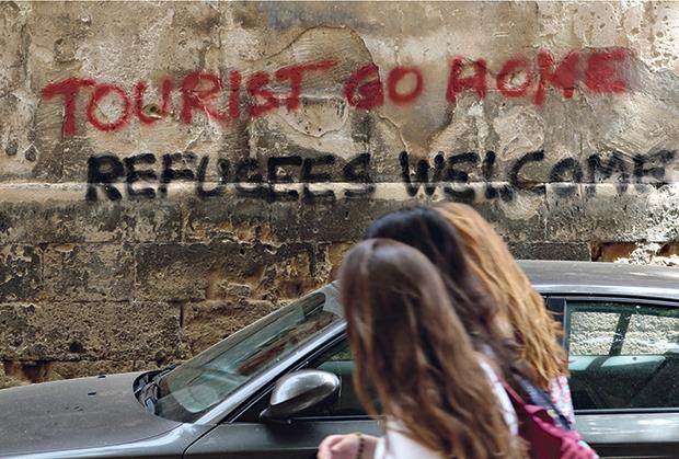„Turisti, idite kući, izbeglice su dobrodošle“ i „Turisti, vi ste teroristi“, najčešći su grafiti.