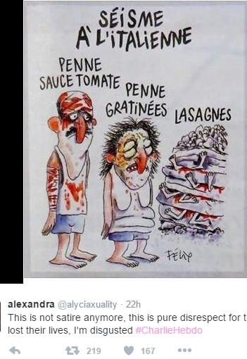Gradonačelnik mesta Amatriče, koje je najteže pogođeno zemljotresom, Serđio Piroci, rekao je da je šokiran karikaturama i dodao da je uveren da takva neprijatna satira ne odražava osećanja Francuza.