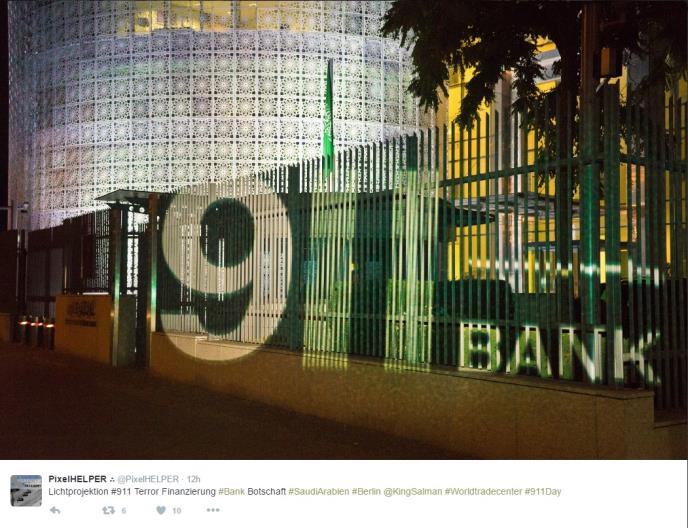Članovi grupe PixelHELPER, koju čine buntovni nemački umetnici i politički aktivisti kontroverznih stajališta izveli su performans na zgradi Ambasade Saudijske Arabije u Berlinu i osvetlili je natpisom "Banka 9/11".