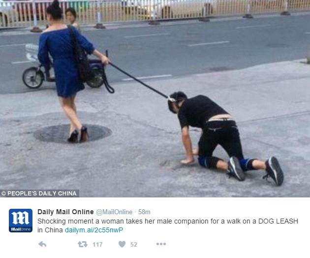Bizarne slike snimljena je u Kini a na njoj se vidi mlada žena koja šeta mladića na uzici za pse i to nasred ulice.