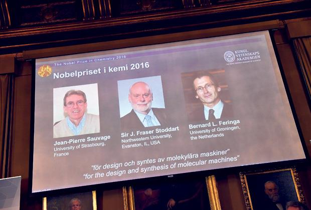Trojica naučnika će podeliti nagradu od osam miliona švedskih kruna (830.000 evra). Minijaturne mašine s kontrolisanim pokretima koje su naučnici dizajnirali mogu da izvršavaju zadatke kada im se doda energija. Sovaž (71) profesor je u penziji na Univerzitetu u Strazburu. Stodart (74) profesor je hemije na Univerzitetu Nortvestern u Evanstonu, u američkoj državi Ilinois, a Feringa (65) predaje organsku hemiju na Univerzitetu u Groningenu.