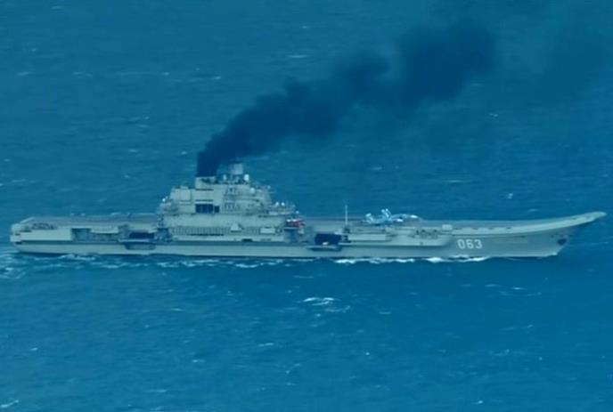 Ruski nosač aviona „"Admiral Kuznjecov",“ u pratnji broda Ratne mornarice Norvešške, prolazi kroz kanal Lamanšš na putu ka Siriji.