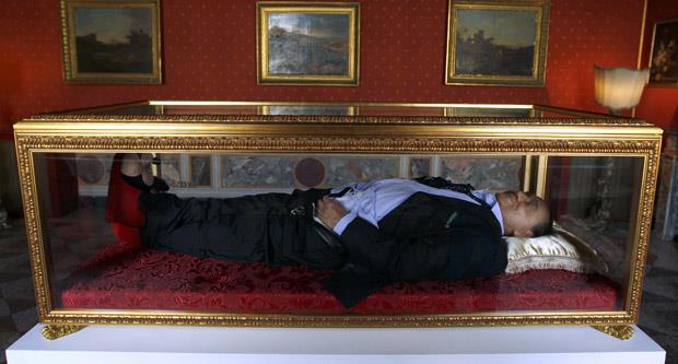 U staklenom kovčegu, naravno, nije Berluskoni već voštana figura, a cilj ove kontroverzne izložbe jeste da se našali na račun bivšeg italijanskog premijera, njegove perverznosti i nezajažljivog seksualnog apetita zbog kojeg je završio i na sudu.