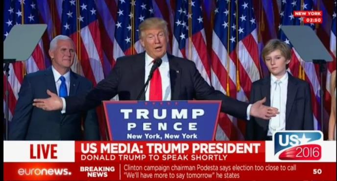 08:52 - "Žao mi je što ste čekali, ovo je komplikovan posao. Hvala vam mnogo. Upravo sam primio poziv od sekretarke Klinton. Čestitala nam je na pobedi, jer ovo je naša pobeda, i ja čestitam njoj i njenoj porodici na veoma teškoj borb", rekao je Tramp.