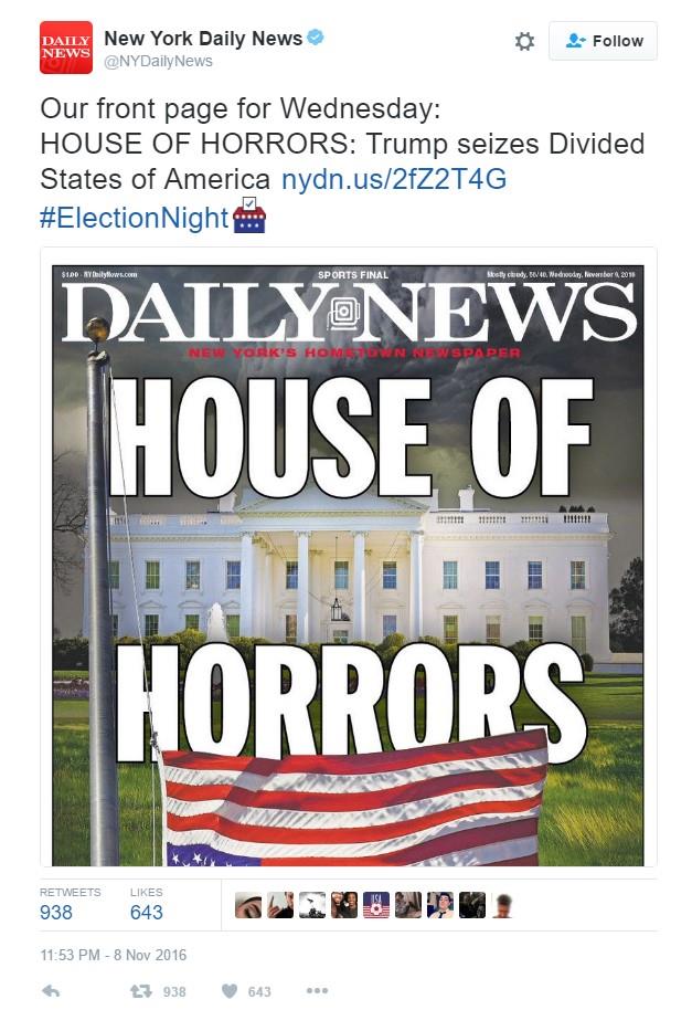 S druge strane "Dejli Njuz" je stavio sledeću naslovnu: "Kuća horora: Tramp grabi ka podeljenim Sjedinjenim državama"