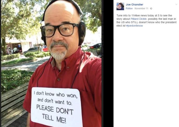 Džo je umetnik koji radi od kuće, a od 8. novembra izbegava televiziju, novine i društvene mreže kako do njega ne bi stigla informacija ko je novi američki predsednik.