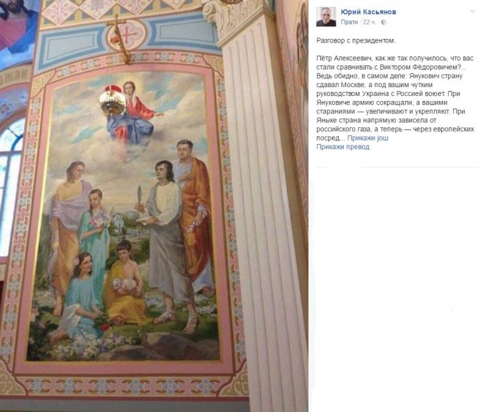 "Negde pored ove slike leži zlatni hleb“, napisao je Kasjanov na Fejsbuku. Prema njegovim podacima, freska je naslikana u kapeli ukrajinskog predsednika u okviru njegove kuće.