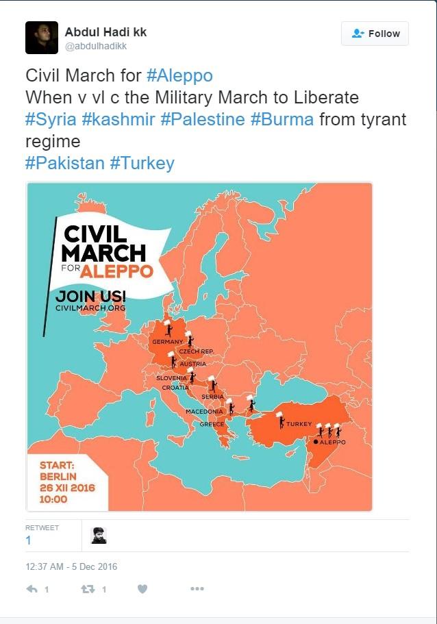 Marš za Alep, pri čemu su učesnici nosili bele zastave, počeo je na nekadašnjem berlinskom aerodromu Tempelhof.