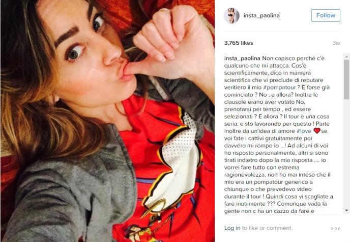 Paola Saulino koja ima 27 godina rekla je fanovima kako je ona žena od reči pošto je krajem prošle godine najavila turu u 10 Italijanskih gradova u Decembru. Paola je postavila svoju fotografiju na Instragramu u subotu i napisala “Prva tura oralnog seksa je završena! Malo sam umorna, ali sve je ok”.