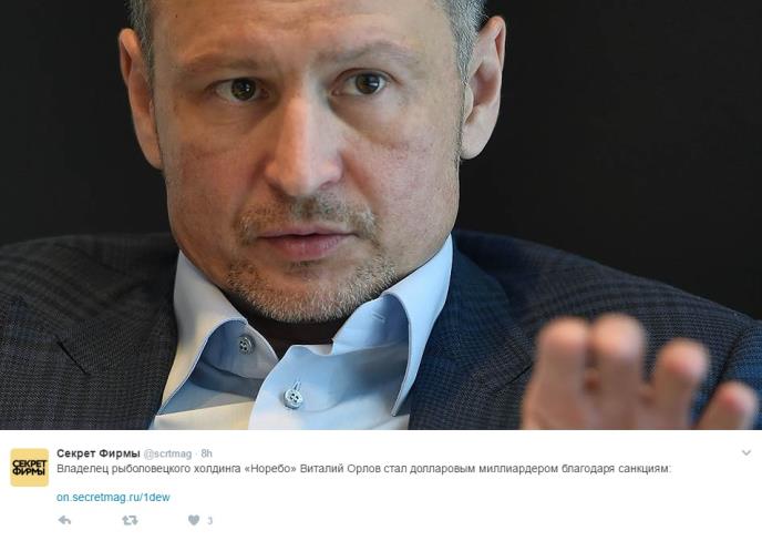 Agencija navodi da je biznisu Orlova pomogla zabrana uvoza inostranih proizvoda u Rusiju, koja ja uvedena kao odgovor na antiruske sankcije zapadnih zemalja. Ograničenja su dovela do porasta unutrašnje potražnje za konzerviranom ribom.