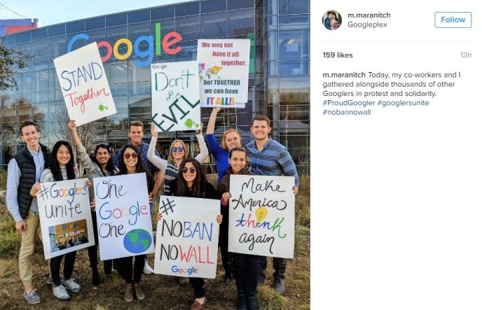 Hiljade radnika kompanije Gugl organizovali su proteste protiv odluke predsednika Donalda Trampa o zabrani putovanja u SAD za stanovnike 7 muslimanskih zemalja.