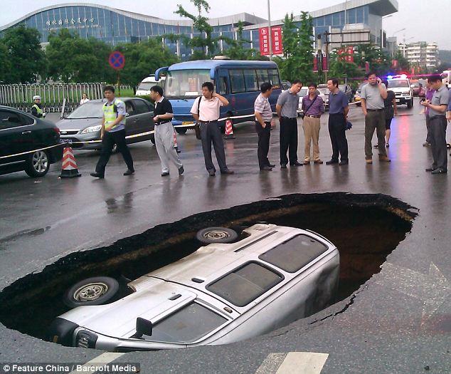 Ovaj ambis otvorio se iznanada nasred ulice tako da je Kinez sa svojim kombijem u njega upao u toku vožnje, piše britanski Dejl mejl.