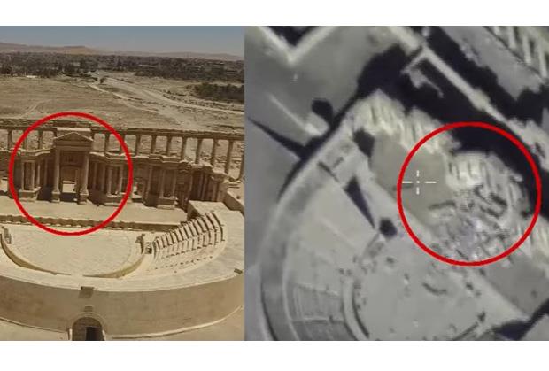 .Na videu se vidi da su teroristi Islamske države uništili Centralni dio drevnog rimskog teatra i kolone tetrapilona. Zgrada je bila izgrađena 270 godina pre nove ere.