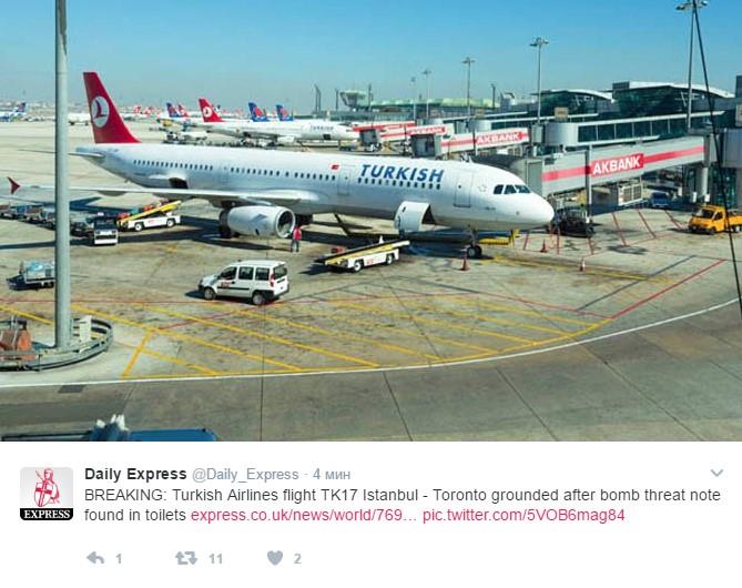 Zvaničnik pres službe "Turkiš erlajnza" kazao je za AP da je kabinsko osoblje aviona na letu TK-17 našlo poruku "Bomba za Toronto" ispisanu velikim slovima na zidu toaleta.