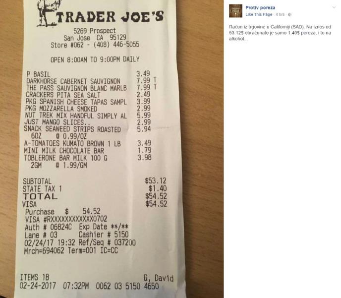 Slične reakcije izazvao je i račun iz Kalifornije gde je na iznos od 53,12 dolara obračunato samo 1,40 poreza, i to na alkoholna pića.