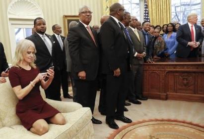Fotografija Kelijan Konvej, savetnice Donalda Trampa, kako kleči u Ovalnom kabinetu tokom sastanka s predstavnicima afroameričkih univerziteta i fakulteta, izazvala je buru na društvenim mrežama.