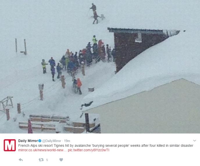 U lavini koja je pogodila francuski ski centar Tinj, mediji su javili da se najmanje trideset ljudi nalaze ispod snega. Ipak, potraga je okončana i prema poslednjim informacijama nema mrtvih