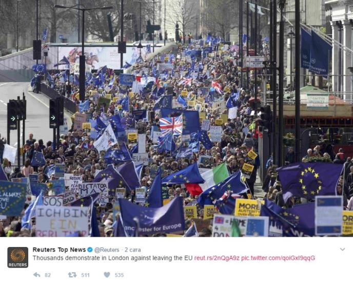 Četiri dana uoči pokretanja postupka za izlazak Velike Britanije iz Evropske unije (EU) i na dan kada Unija slavi 60. rođendan, desetine hiljade ljudi učestvovalo je danas u maršu protiv Bregzita u Londonu.