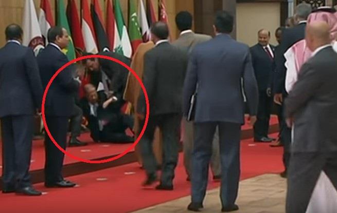Žestinu udarca možda najbolje potvrđuje snažan zvuk pada, a ošamućenom predsedniku Libana pomogli su ostali učesnici.