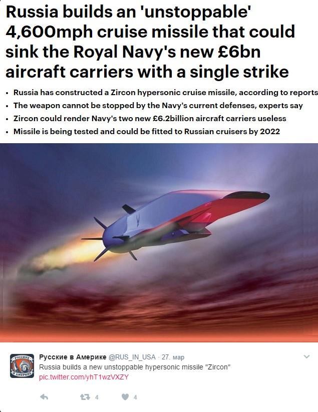 Reagujući na razvoj Cirkona, nekoliko novina u Velikoj Britaniji ovih dana je upozorilo da bi time postali ranjiviji čak i najmoderniji ratni brodovi SAD i Velike Britanije - uključujući i nosače aviona.