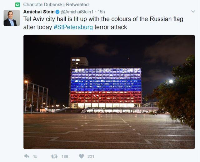 Izrael je, međutim, izrazio svoje saučešće i solidarnost sa žrtvama osvetlevši gradski parlament u Tel Avivu bojama ruske zastave.