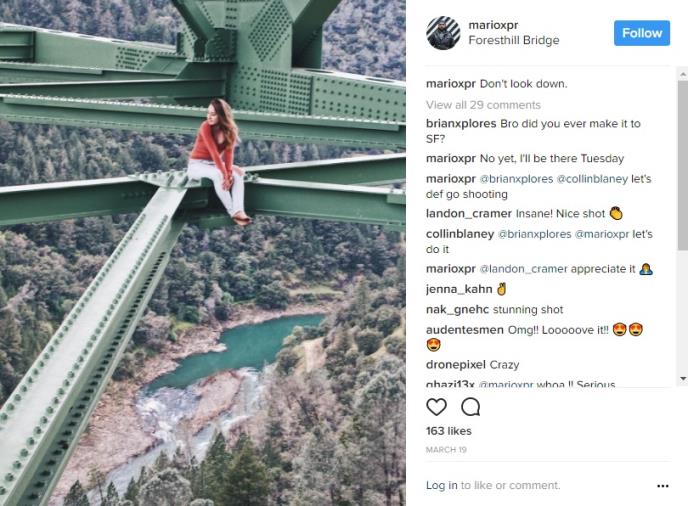 Najviši most u Kaliforniji, Foresthil blizu Sakramenta, postao je stecište raznih ljubitelja selfija koji se utrkuju ko će imati napraviti vratolomnije i ekstremnije fotografije kako bi ih okačili na Fejsbuk, Instagram, Snepčet i svaku drugu moguću društvenu mrežu.