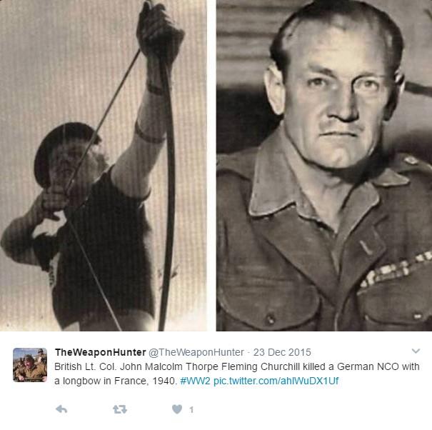 Tokom 1940. u borbi kod Dankirka, gde je 300.000 vojnika bilo nasukano na plažama i morali su da budu evakuisani, Čerčil je oborio nemačkog vojnika strelom. On je kasnije viđen kako se probija na motoru sa svojim lukom okačenim na stranu, dok je kapa nemačkog oficira visila na farovima. To je bilo prvi i jedini put da je neki vojnik u II svetskom ratu ubijen strelom.