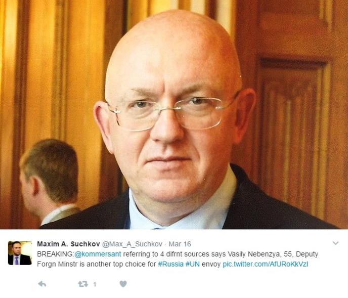 Novi stalni predstavnik Rusije u UN biće zamenik ministra inostranih poslova Vasilij Nebenzja. Kandidaturu Nebenzje treba da odobri Donji i Gornji dom Parlamenta. Prema mišljenju bivšeg zamenika generalnog sekretara UN i bivšeg zamenika ministra inostranih poslova Sergeja Oržonikidzea, problema sa imenovanjem Nebenzje neće biti.