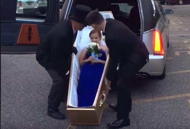 Sedamnaestogodišnja Flaerti, učenica srednje škole u Nju Džersiju, šokirala je svoje prijatelje kada se na maturi pojavila u mrtvačkim kolima i kovčegu!