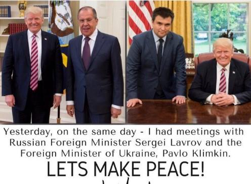 Američki predsednik Donald Tramp objavio je na Tviteru fotografije sastanaka sa šefovima diplomatija Rusije i Ukrajine ispod kojih je napisao: "Hajde da gradimo mir!".