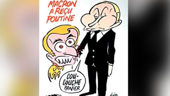 Satirični nedeljnik Šarli ebdo objavio je karikaturu sastanka predsednika Rusije Vladimira Putina i njegovog francuskog kolege Emanuela Makrona, koga je prikazao kao štene.