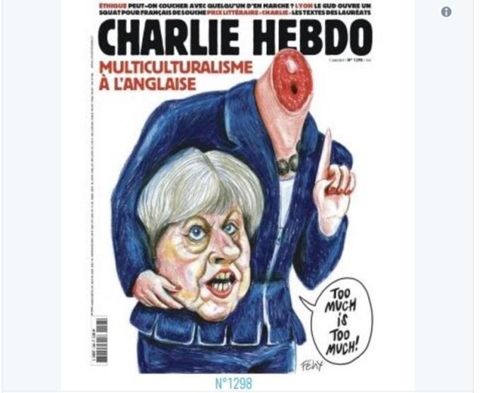 Najnoviji broj časopisa Šarlie ebdo donosi karaikaturu obezglavljene Tereze Mej koja nosi svoju glavu.