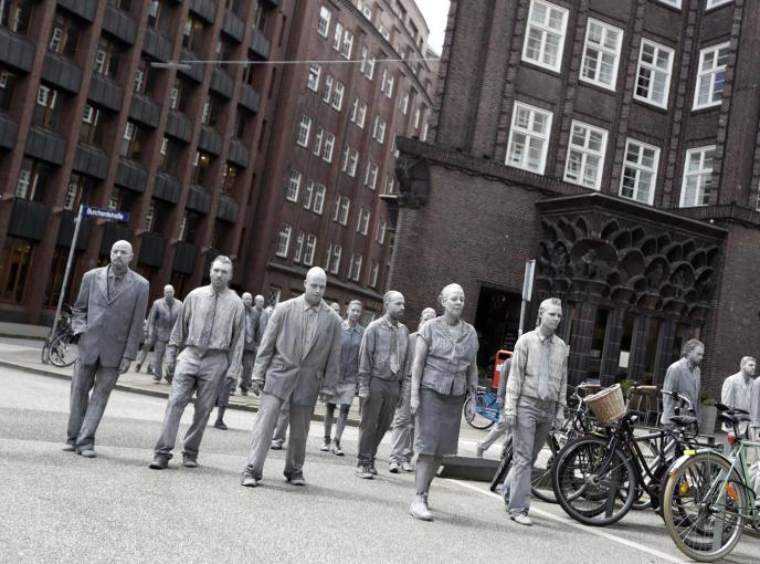 Hamburgom su šetali i puzali "zombiji" u sivim odelima sve dok jedan nije skinuo svoju masku i otkrio živopisnu odeću.