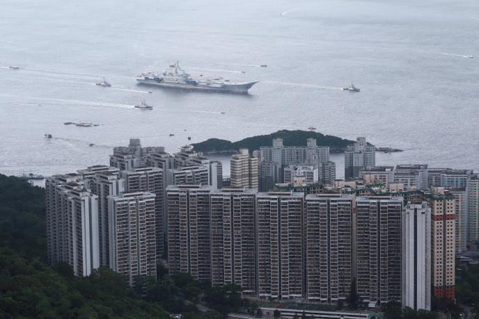 Turisti i stanovnici okupili su se kako bi videli nosač aviona, koji učestvuje na obeležavanju 20 godina od prelaska tog grada iz britanske pod kinesku upravu.