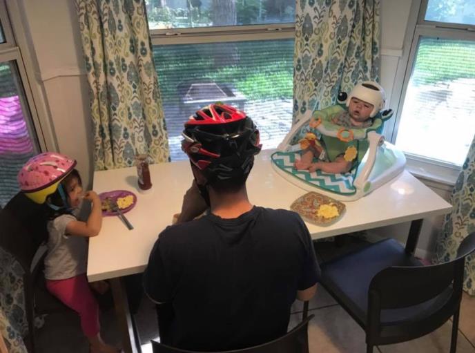 Jonasova trogodišnja sestra odlučila je da i ona nosi biciklističku kacigu da se njen brat ne bi osećao drugačijim, ali ostatak porodice ubrzo se pridružio.