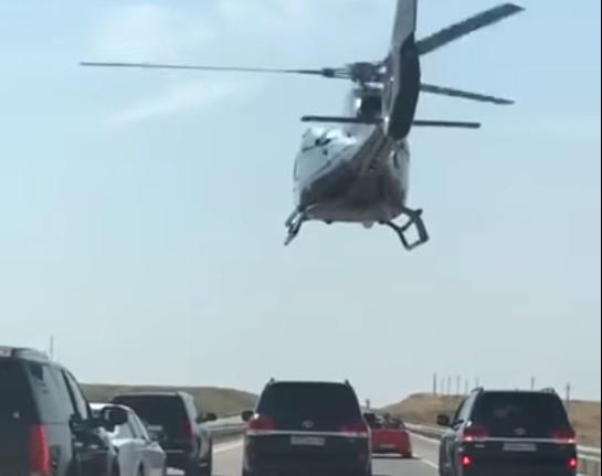 Na video-snimku se vide luksuzni automobili kao i helikopter koji leti bukvalno nekoliko metara iznad puta u sastavu kolone.
