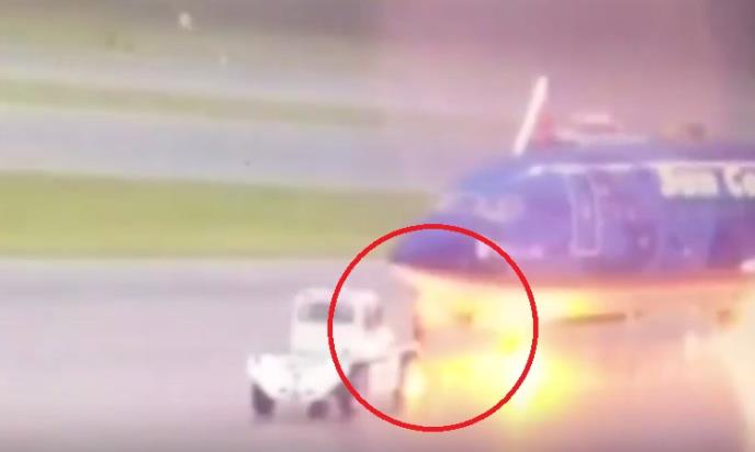 Na snimku se vidi kako grom udara u avion i muškarca koji stoji pored. Nakon kratke varnice, radnik pada na zemlju.