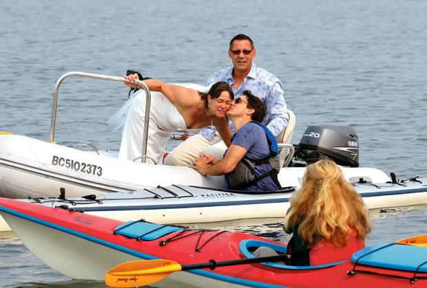 Dok su uživali u vožnji, naišli su na jedan par koji samo što se venčao. Premijer je iskoristio priliku i čestitao je mladencima, izljubivši mladu, koja je bila u venčanici. Nakon kraćeg razgovora Trudo je sa suprugom nastavio vožnju kajakom, a kosmička pravda zakletog šarmera stigla je kad je pokušao da izađe iz plovila. Spetljao se i upao u more, dok se njegova supruga od srca nasmejala.