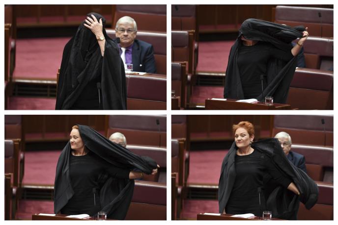 Hansonova je sedela na svom mestu u parlamentu u crnoj burki dvadesetak minuta a zatim je skinula kako bi pozvala na zabranu njenog nošenja u javnosti zbog nacionalne bezbednosti.