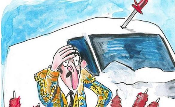 Na karikaturi je beli kombi sa ulubljenom haubom, a pored njega toreador. Na crtežu, objavljenom na sajtu časopisa, toreador se drži za glavu i gužva crvenu tkaninu u ruci.