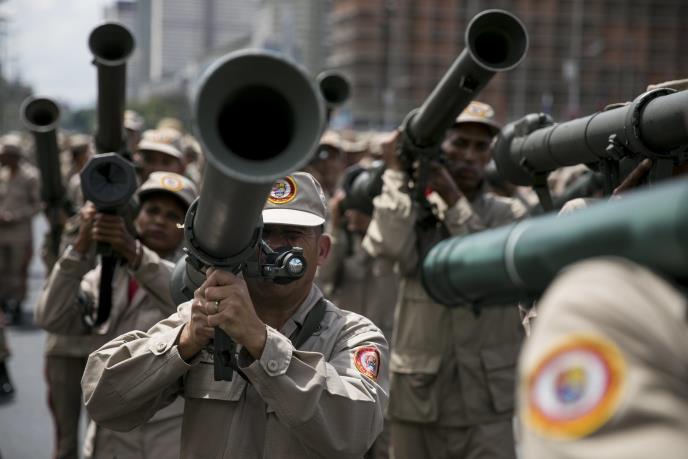 U Karakasu u kome su snage reda i policije defilovale u subotu, pristalice vlade odeveni u crveno oprobali su se u rukovanju puškom ili borbenim tehnikama u okviru "protivimperijalističkog marša".