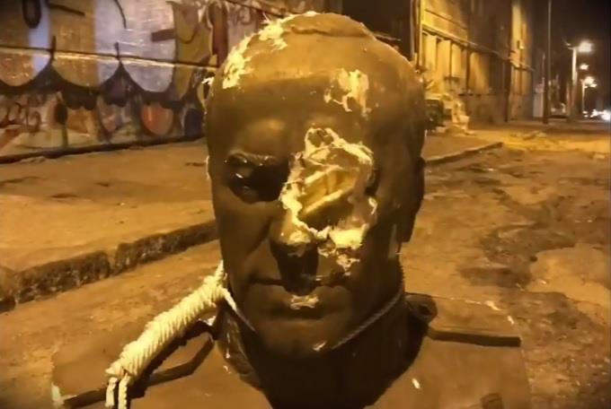 Na noćnim snimcima, grupa mladića prvo obara bistu sa postamenta, a zatim skulpturi oko vrata kači omču i „veša je“. Vandali su se potom uz smeh, paljenje baklji i uzvikivanje pozdrava ukrajinskih nacističkih pomagača na zapadu ove zemlje u Drugom svetskom ratu „Slava Ukrajini.