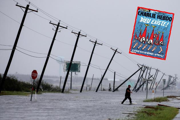 Uragan Harvi koji je opustošio američku saveznu državu Teksas, i izazvao veliku poplavu koja je potopila Houston za francuski satirični list Šarli Ebdo dokazuje da - Bog postoji.