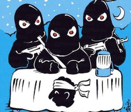 Na karikaturi se nalaze tri figure obučene u crno i prekrivene fantomkama kako sa mašinkama "zahtevaju debatu". Ne samo što je ovo opaska na korzikanski pokret koji je u svojim akcijama često koristio oružje, već i poruka katalonskom lideru Karlesu Puđdemonu da bi možda i on mogao na taj način da započne dijalog.
