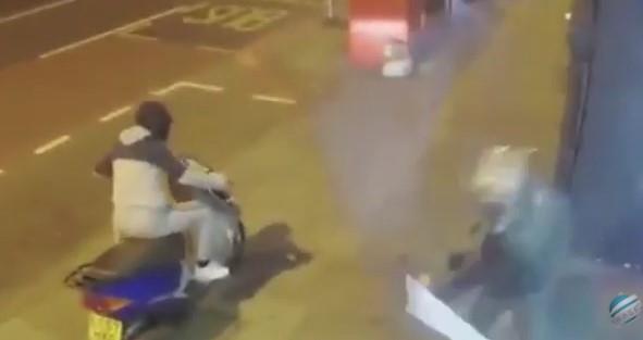 Pošto su na skuteru došli do svoje mete, jedan od njih uzima alat za razbijanje i pokušava da razbije staklo na prozoru kancelarije.