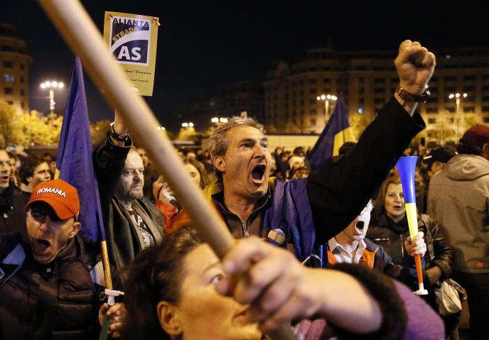 Demonstranti su se okupili ispred zgrade Vlade, nose rumunske zastave i uzvikivali: "Demokratija je pod opsadom" i da je vladajuća Socijaldemokratska partija "crvena kuga".
