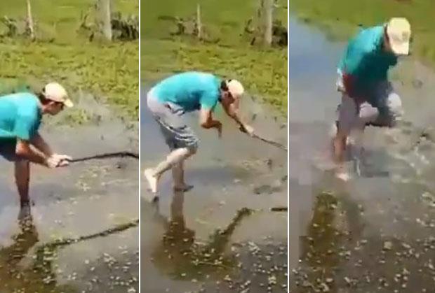 Na snimku se naime vidi da mladić pokušava da kundakom napunjene puške udari ribu kako bi je ulovio, ali se njegov poduhvat nesrećno završio.
