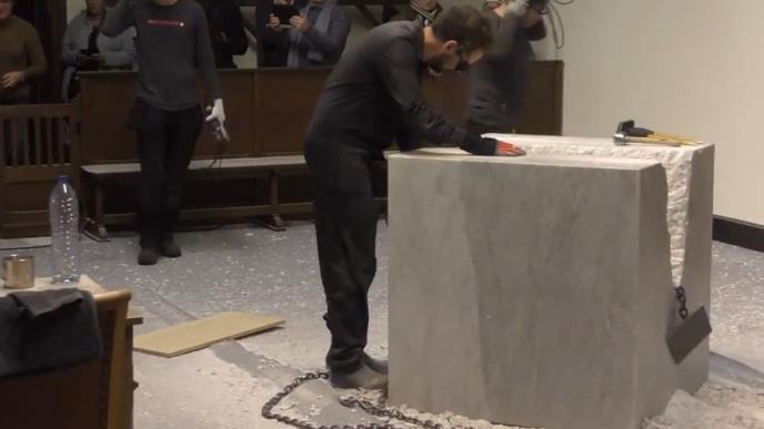 Belgijanac Mikes Pope, koji se vezao lancem za mermerni blok kako bi pokazao da su umetnici svojevrsni zatočenici pod "teretom istorije", nije uspeo da se sam oslobodi pa su mu, posle 19-dnevnog performansa, presekli okove.