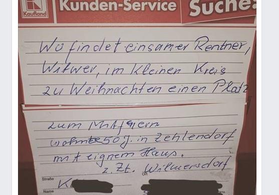 Jedan od takvih je i jedan deka iz Nemačke, udovac. Nije želeo da Božić provede sam, pa je napisao dirljivu poruku i zalepio je na zgradu obližnjeg supermarketa.