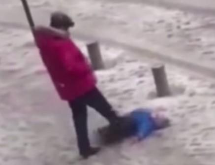 Čoveku od oko 50 godina u glavnom gradu Kirgistana, Biškeku snimljen je kako šutira svog sina u stomak jer mališan koji se okliznuo na ledu nije uspeo da se podigne sa zemlje.